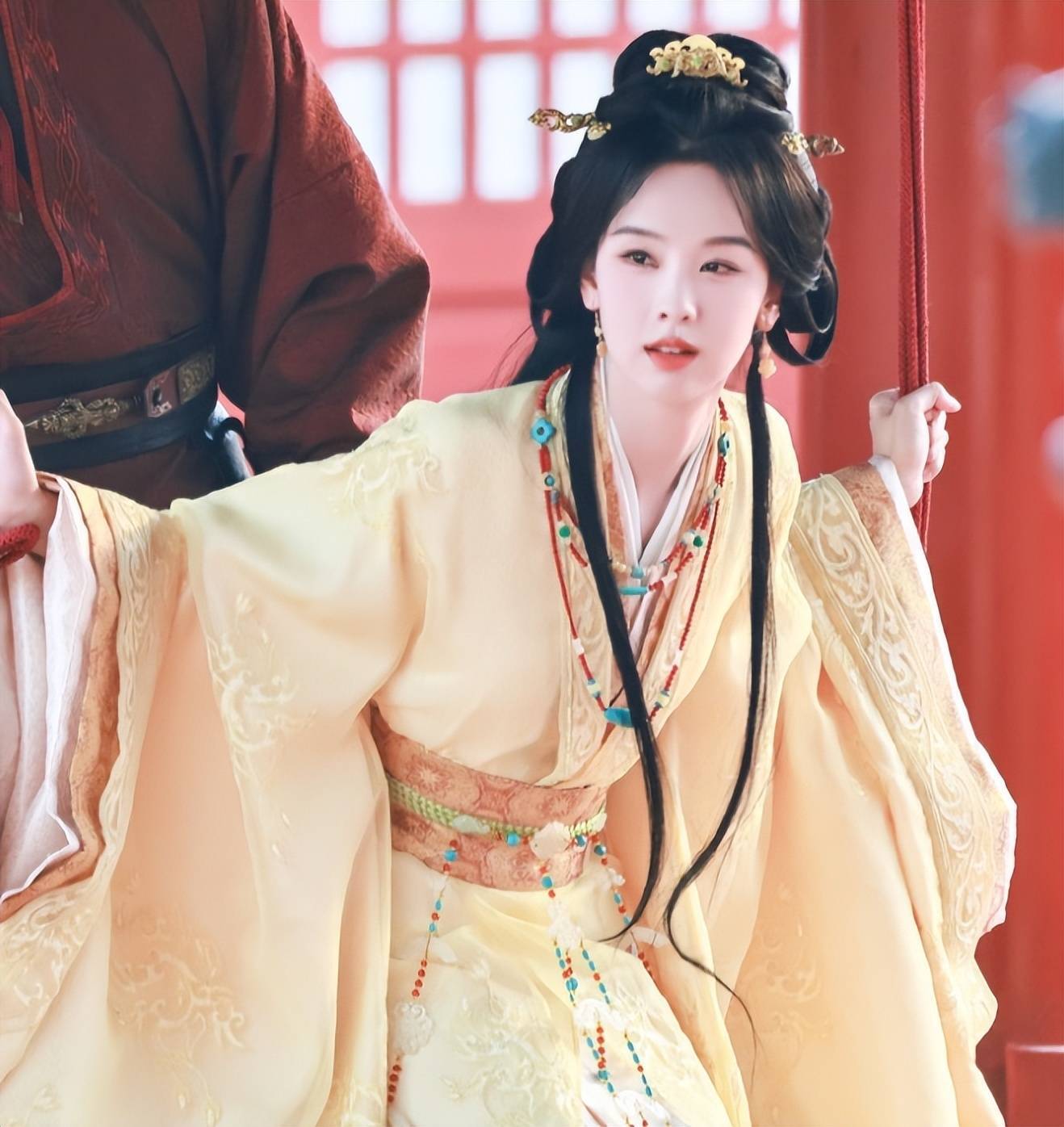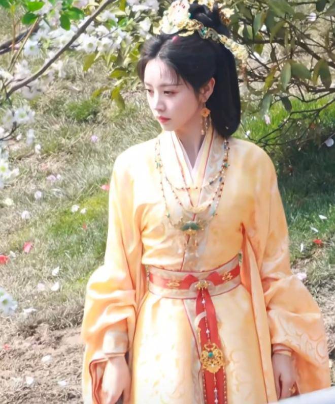 穿着黄色魏晋风古装的陈都灵少了几分清雅出尘的仙气,看起来眉眼温柔,简直就是养在深宫中无忧无虑的小公主。